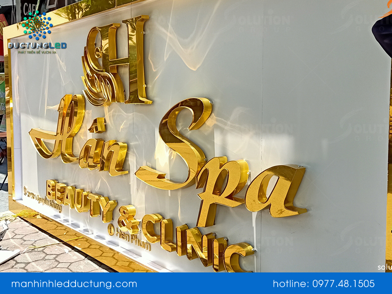 Bảng hiệu Inox phong cách có chi phí thiết kế khá cao các thông tin như thương hiệu spa được làm từ chữ inox cao cấp phần đèn LED viền bảng hiệu chỉ có tác dụng chiếu sáng xung quanh nhằm làm nổi bật biển hiệu. Bảng hiệu này chi phí khá cao nên thường xuất hiện tại các trung tâm Spa lớn lâu năm.